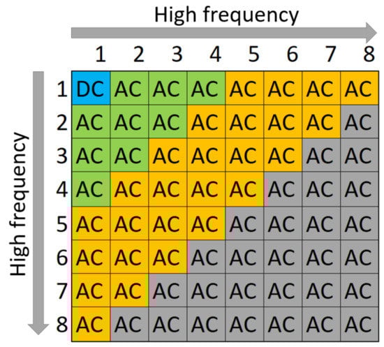 Returning to camera sensors, fixed-pattern noise (FPN) is a constant variation in pixels recognizable as the same pattern of darker and brighter pixels in images that are taken in uniform illumination conditions. The FPN can be defined as , where X is the original image and is the filtered image. The noise extracted by this procedure depends on various manufacturing imperfections that are unique to each sensor. Furthermore, this noise can be used to generate a PUF since it contains characteristics that are unique to a device and can be further used as inputs to a cryptographically secure function as presented in various works like [4,5,6]. There are two types of FPNs: (i) dark signal nonuniformity (DSNU), which accounts for variations in pixels offsets under no illumination conditions (dark frame), and (ii) photo response nonuniformity (PRNU), which is a variation between pixels under illumination conditions (light frames). In this work, we focus on DSNU alone, which gives more accuracy and is no less practical to use. Discrete Cosine Transform (DCT) is a method to transform image pixels into the frequency domain from the spatial domain. DCT is commonly used in the JPEG compression algorithm for images. In JPEG compression, the two-dimensional Discrete Cosine Transform (2-DCT) is applied on × nonoverleaping blocks of the image. For each 8 × 8 block, 64 DCT coefficients are obtained, from which the first coefficient, from the upper left corner, is the DC coefficient and the remaining 63 are the AC coefficients [7]. In Figure 2, we depict the DC coefficient in blue, low-frequency AC coefficients in green, mid-frequency AC coefficients in orange, and finally, the high-frequency AC coefficients in gray (these correspond to the DCT of an × image block; this block size is specified for encoding in the ISO/IEC 10918-1:1994 standard for digital compression and coding of digital images [7]). Since high-frequency coefficients are sensitive to distortions, they are influenced by JPEG compression, and in this work, we use only the low and mid-frequency AC coefficients. Additionally, the human eye is more sensitive to low frequencies and less sensitive to high frequencies.