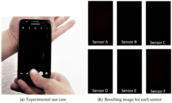 In this section, we give a brief overview of the setup and methodology. First, Figure 3a shows the experimental use case: a user taking a dark picture by holding the phone against their palm to fingerprint the sensor. In Figure 3b, we show an example of 6 dark images captured with the 6 cameras. This movement is simple, and users can collect such data without much effort. We acquired 50 dark images with each camera by this procedure. The experiments were performed at room temperature, i.e., around 22 ∘C elsius.