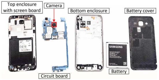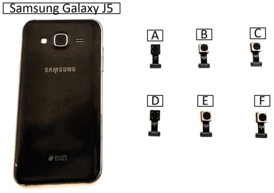 In our fingerprinting scenario, we use a Samsung Galaxy J5 smartphone with 13 MP sensors, f1.9, 28 mm (wide) lens, AF capable camera. Figure 4 shows the dismantled Samsung Galaxy J5 for camera replacement. To the original smartphone, we add six identical camera circuits (these are connected to the same Samsung Galaxy J5 smartphone) in order to avoid imperfections due to the rest of the electronics inside the smartphone and obtain an accurate measurement for the imperfections in each sensor. Indeed, using distinct smartphones will also contribute to such differences. Our intention was to get an accurate measurement for the imperfections in each sensor. In Figure 5, we show the Samsung Galaxy J5 along with the six cameras. For analyzing and processing the images, we used MATLAB R2020b. The analysis was conducted on a notebook with an Intel(R) Core(TM) i7-6700 processor at 3.40 GHz with 32 GB RAM.