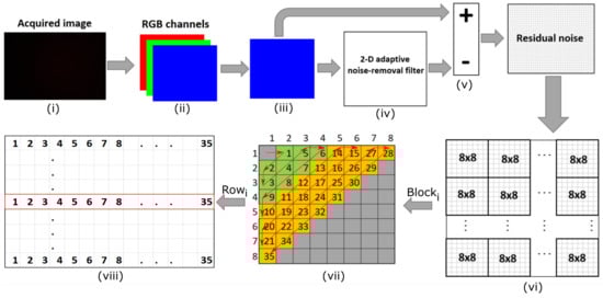 In our investigations, we analyzed portions extracted from the DCT applied over the entire picture, avoiding cropping or resizing, which can influence the fingerprint. We only considered the blue channel because the results were better, as shown in a future paragraph. Additionally, by using a single channel, we improved the computational time. We used a 2-D adaptive noise removal filter, i.e., the wiener2 filter from MATLAB, in order to process the original image. This filter estimates the variance and local mean around each pixel with 10 × 10 local neighborhoods. To extract the pixel variations, we compute the residual noise as the difference between the original image and the filtered image. We split the residual noise in 8 × 8 nonoverleaping blocks. As we also mentioned in the introduction, for each block, we compute the 2-D DCT and we extract the low and mid frequency AC coefficients. Using the zig-zag sequence, from each 8 × 8 block, we obtain an array with 35 elements which are concatenated to obtain the fingerprint. Figure 6 depicts this fingerprint extraction process, which consists in the following seven steps: (i) image acquisition, (ii) splitting the image into RGB channels, (iii) extracting the blue channel, (iv) applying the Wiener2 filter to the blue channel, (v) computing the residual noise as the difference between the blue channel image and the filtered image, (vi) splitting the residual noise into × blocks, (vii) applying 2-D DTC on each 8 × 8 block, and (vii) extracting the low and mid AC coefficients.