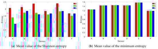 In Figure 7, we depict the two entropies, i.e., the Shannon (a) and minimum (b) entropy, as computed on the red, green, and blue channels of the image (without any processing). The red channel has slightly higher entropy values than the green and blue channels, while the blue channel has the lowest entropy, which strengthens the reason to choose it in the classification process, as it will give more stable results. For the red channel, the mean of the Shannon entropy is 2.0855 and its median is 2.1133. In case of the green channel, the mean is 1.6310 and the median is 1.6354, while for the the blue channel, the mean is 1.5982 and the median is 1.6024. For the minimum entropy, the values on the three channels are nearly identical, suggesting an equal minimum security level.