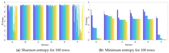 We now compute the values for the Shannon and minimum entropy on the extracted AC coefficients. As expected, the values are higher than previously, generally reaching around 7 bits for each byte in case of the Shannon entropy. This is expected since the image is essentially squeezed into these AC coefficients that represent the color changes. In Figure 8, we depict the Shannon and the minimum entropy per coefficient in case of 100 randomly selected rows. The matrix on which the entropy was computed has 2800 elements. For sensors A and F, the entropy occasionally drops, likely due to environmental factors, as it is hard to take identical dark images when pressing the phone against the palm. However, the minimum entropy is still generally in the range of 2–3 bits for each byte from the coefficients, twice than in the case of the unprocessed images, and for a matrix of 2800 elements, the security level is sufficiently high.