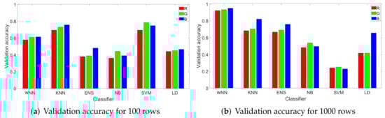 Channel selection. While other works have generally used the green channel for camera identification, we choose the blue channel since our preliminary analysis suggested that this channel gives better results. To support this hypothesis, in Figure 9, we depict as bar charts the validation accuracy for 100 and 1000 randomly selected rows for all classifiers and all three channels. We mark each channel with its corresponding color: red, green, and blue. We used 80% of data for training and the rest of 20% for testing. As it can be easily observed, the blue channel has the best accuracy with NN, KNN, ENS, and LD, while for NB and SVM, the green channel has the better accuracy. Still, NB and SVM give the worst results for all channels on 1000 samples, which deems them unsuitable as classification algorithms for this purpose.