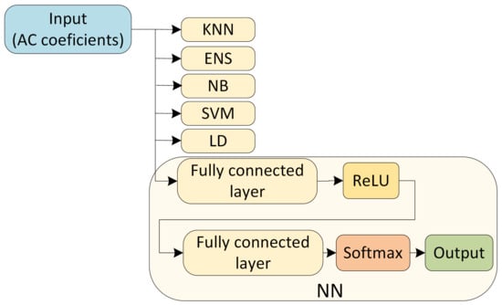 In this section, we discuss the CMOS sensor identification using several classifiers, i.e., linear discriminant (LD), Support Vector Machine (SVM), Naive Bayes (NB), Ensemble-Subspace Discriminant (ENS), Nearest Neighbor (KNN), and a multilayer fully connected neural network (NN).