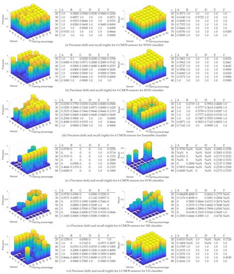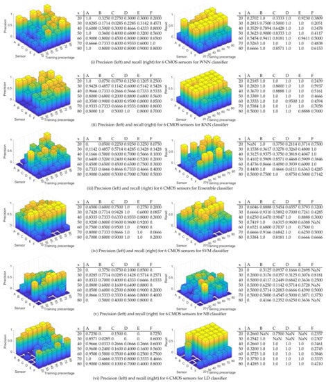 To give a more accurate depiction in Figure 12, we describe as 3D bar charts and numeric values the precision (left) and the recall (right) for each CMOS sensor for all the tested scenarios and all classifiers in case of 100 randomly selected matrices. Details on these are discussed next:
