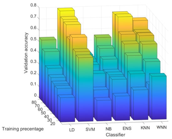 In Figure 13, we depict the validation accuracy for all six classifiers and all test scenarios with 1000 randomly selected rows from each image. Again, the results from this figure are given as average values, and we detail the precision and recall for each sensor in what follows since the results are not uniform. As expected, for each classifier, the validation accuracy is generally increasing with the percentage of training data. As can be easily observed, now WNN has the highest validation accuracy for all training percentages followed by the KNN and ENS. The worst validation accuracy was obtained with SVM. In Figure 14, we describe as 3D bar charts and numeric values the precision (left) and recall (right). Again, we discuss in detail the precision and recall on each of the sensors and classifiers: