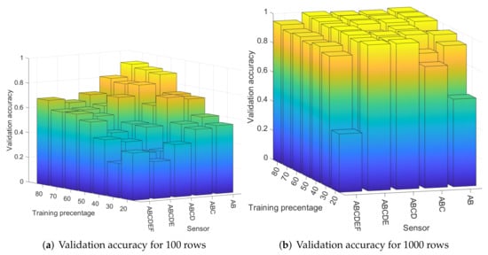 In order to compare the validation accuracy for classifying a distinct number of sensors, we ran the WNN classifier for two, three, four, and five sensors. In Figure 15, we show the results for 20% to 80% training percentage when two sensors (A and B), three sensors (A, B, and C), four sensors (A, B, C, and D), five sensors (A, B, C, D, and E), and finally all six sensors are classified (A, B, C, D, E, and F). In Figure 15a, we depict the results for 100 rows, and in Figure 15b, we depict the results for 1000 rows. The validation accuracy decreases as more sensors are added, which is visible especially for the case of 100 rows in Figure 15a. When we increase the number of the rows to 1000, the difference in the validation accuracy for classifying two, three, four, five, and six sensors is not significant, as can be seen in Figure 15b. This way, we can confirm that although by increasing the number of sensors the accuracy lowers, the results will still be good if sufficient data is added, e.g., 1000 rows with AC coefficients are used.