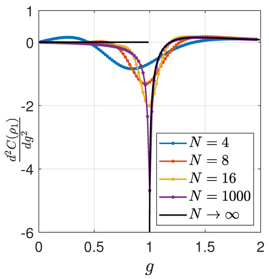 In Figure 1 we present the second derivative of QSCM with respect to the transverse field parameter g, for different finite system sizes . We also calculated this derivative in the thermodynamic limit by using Equation (24) and Equation (29).