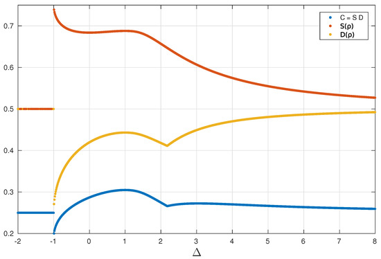 In Figure 2 we show the QSCM, , for nearest neighbor, in contrast with the von Neumann entropy and the trace distance between and the normalized identity matrix, all as a function of the uni-axial parameter strength . The XXZ model possess two critical points: the first-order transition occurs at , and also a continuous phase transition shows up at [66]. An interesting feature of the QSCM is the fact that it evinces points of correlation transitions, related to the order–disorder transitions, which may not necessarily be connected with phase transitions. In this respect, we take note of the cusp point in Figure 2, at .