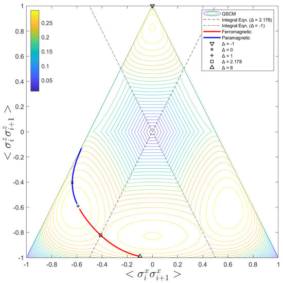 In Figure 3, we call attention to a contour map of in function of , and . The triangle region represents the convex hull of positive semi-definite density matrices. The vertices of this triangle are given by: and . Along with the contour map of QSCM as a function of the correlation functions in x and z directions, the integral equations obtained while the two eigenvalues of goes to zero are also represented in Figure 3. These integral equations are represented by the two inclined straight lines (the dash and dash-dot ones). The dash and inclined straight line describes the integral equation whose solution is . The dash-dot straight line represents the curve for solution, for which there exists a divergence point (the phase transition point).