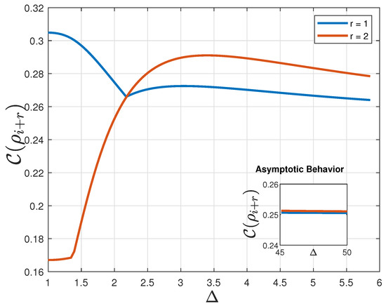 Here we are interested in quantum correlations between the nearest and next to nearest neighbor spins in the XXZ spin- chain with , at a temperature of , and zero external field (). The matrix elements of are written in function of expectation values which mean the correlation functions for nearest neighbor , (for ), and the correlation functions for next-to-nearest neighbors , (for ), and they are given by a set of integral equations which can be found in Appendix B or in [48,53,63,64,65]. These two point correlation functions for the XXZ model at zero temperature and in the thermodynamic limit can be derived by using the Bethe Ansatz technique. In Equation (30), due to the symmetry in the Hamiltonian model, it is presented the two-qubit reduced density matrix of sites i and , for , in the thermodynamic limit, written in the basis , , and , where and are the eigenstates of the Pauli z-operator [48]:
