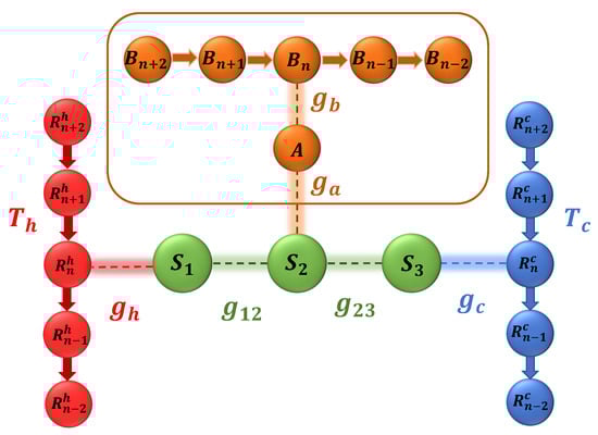 We consider a system made out of three qubits, namely , and , arranged on a line. and interact with a set of ancillary qubits representing the hot and cold thermal baths (temperatures and ), respectively, which we refer as and . Each system qubit interacts with its nearest neighbor, In addition, we have a HSE, which is composed of a qubit A, with which directly interacts, and a set of ancillary qubits interacting with qubit A. Our main goal is to study the effect of the HSE interacting locally with , and also the effect of the coherence in qubits, on energy transfer from the hot bath to the cold bath. We setup our model in the described fashion in order to mimic a similar model considered in [], which presents an experimental investigation of the light harvesting complexes. A schematic representation of our model is given in Figure 1.