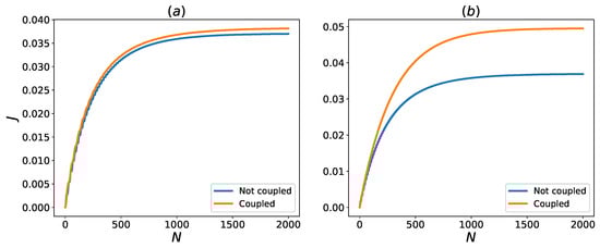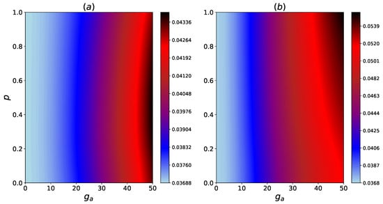 In Figure 6, the values of by changes in the coherence parameter p and is shown. There is a limited gain in for an increased p, especially for smaller values of . This gain is more significant for larger values of . As the comparison between Figure 6a,b indicates, this effect is more pronounced for a larger coupling.