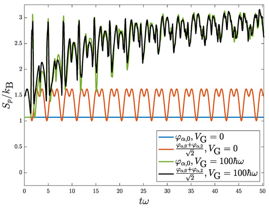 which basically still oscillates in the harmonic trap with period , since is a periodic function of time, but with the shape modulated by a period due to the factor . Here, denotes the real part of A. For the case of single CGS, distribution Equation (19) reduces to , which oscillates with a period and without changing its shape, so that the corresponding entropy is just a constant according to Equation (6) shown as the blue horizontal line in Figure 1. This can also be verified by the vanishing of the first term on the right-hand side of Equation (14) (see Appendix A for details). For the case of a mixture of GCS, the wave packet again oscillates inside the harmonic trap but with the shape of density modulated periodically. Therefore, its corresponding entropy is periodic in time as shown with the red line in Figure 1.