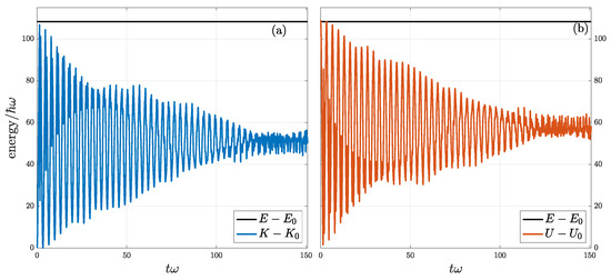 To monitor the evolution of kinetic and potential energies of the wave packet during its oscillation within the trap and the energy exchange between these two energy components, it is useful to consider the free energy of the system: , where E is the total energy. Since total energy is conserved all the time, , with corresponding to the initial total energy of a wave packet, which is an GCS (or a mixture of GCSs) of the harmonic trap placed off-center initially. corresponds to the total energy of the initial wave packet located right at the center of trap, which would be stationary if the barrier potential is neglected. Here, and similarly with K () and U () corresponding to kinetic and potential parts of energy. Basically, since the shape of wave packet is the same, and due to the initial off-center displacement of the wave packet. Therefore, , which means that the initial free energy is the initial excessive potential energy. When there is no barrier potential, the wave packet would keep its coherence with free energy conserved and just re-distributed into kinetic and potential energies dynamically. It means that wave packet oscillates within the trap without thermalization as indicated by its non-increasing Shannon entropy depicted by the blue and red lines in Figure 1. Meanwhile, both and are periodic in time with their sum, , fixed in time, which means kinetic and potential energies fully exchange with each other during oscillation similar to a harmonic oscillator free of friction.