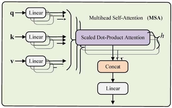 Figure 1 introduces a multihead self-attention (MSA) [35] mechanism that can be used to increase the performance of the SA layer, in which we run h self-attention operations (named “heads”) in parallel and project their concatenated outputs. It is given by Equation (2), and when changing h, Dh is usually set to D/h to maintain the number of calculated parameters constant.