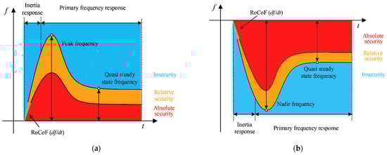 The proposed FSI aims to qualitatively evaluate the frequency stability of a power system for a specified operating condition. When an incident occurs, the system frequency response can be divided into three states: insecurity, relative security, and absolute security. In Equation (13), the numbers 0, 1, and 2 indicate insecurity, relative security, and absolute security, respectively.