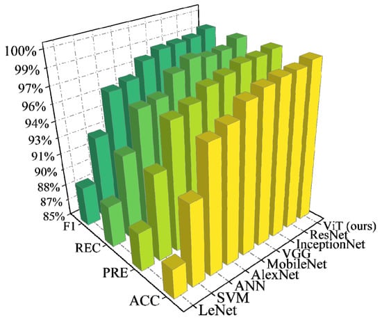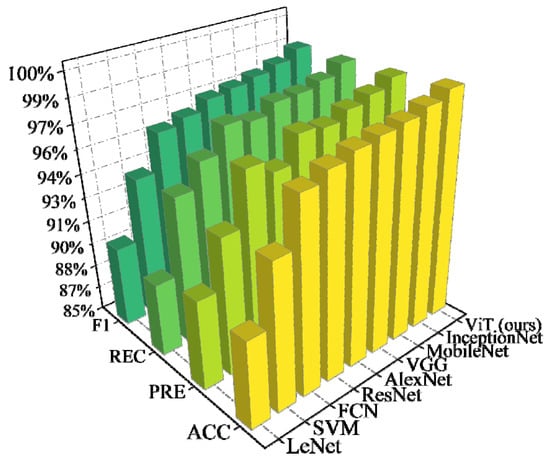 The ViT adopts a pure transformer architecture, which has minimal changes for performing image classification tasks and achieves better performance than ResNet [37]. It follows the raw design of transformers as much as possible. Figure 2 depicts the framework of the ViT.