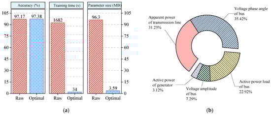 The detailed configurations utilized for dataset generation are summarized in Table 3. The FSI was used for each sample to annotate the corresponding frequency stability category. The required input data for the FSI calculation process are listed in Table 4. Consequently, 69,768 labeled samples were formed under the above conditions. As described in the CE-based feature selection discussion, the input data obtained within 0.32 s were selected as a subset with 96 features. The number of sample points was , and the input sample of each disturbance was . In the subsequent experiments, the dataset was divided randomly at a 7:3 ratio into training and test datasets to assess the performance discrepancies among various methods.
