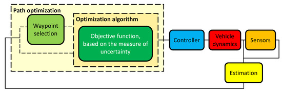 There are studies of informative path planning (IPP), which can be defined as the generation of a path or trajectory for a mobile sensor that maximizes the information gathered about its environment [15,16,17,18]. When formulated as an optimization problem, IPP comprises the key components depicted in Figure 1.