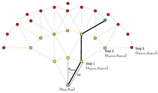 The value of m is chosen based on a trade-off between decision resolution and computational efficiency. Multi-step planning provides a larger search area by determining waypoints several time steps in advance; we call these steps look-ahead steps. For each point on the arc at time , another arc can be calculated, representing the candidate waypoints at time . This branching process can be extended for an arbitrary number of look-ahead steps. Denote by l the number of look-ahead steps, then m points on each arc and l steps of looking ahead amount to a search area of candidate waypoints (see Figure 3), and objective function evaluations at each look-ahead step. Thus, low computational complexity favors a small l.