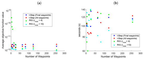 In Figure 4a, the RIG variant using achieved an objective function value of approximately two orders of magnitude larger than the other algorithms for a small number of samples. This is due to the RIG algorithm not being able to build up a sufficiently large map, when is increased to 10, this issue is avoided and the RIG algorithm exclusively outperforms the others, but it should be noted that this greatly increases the computational complexity of the algorithm (see Section 5.6). Comparing LSLA when all waypoints were evaluated with when only the lth step waypoints were evaluated, neither one clearly outperformed the other with respect to an average objective function value, however, the settling time was, in general, (Figure 4b) better when all of the waypoints were considered. The benefit of evaluating all of the waypoints is that short-term maneuvers can be considered, at the expense of slightly more computational complexity.