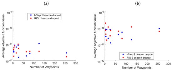 Figure 5 presents the third scenario, where beacons were mobile and after 200 s, communications were disrupted between the vehicle and one (Figure 5a) or two (Figure 5b) beacons. The simulation parameters were the same as in Figure 4, LSLA evaluated all waypoints, , and . The RIG algorithm parameter and the number of waypoints was 81. Comparing the average objective function values in Figure 5, with those in the case where there are no beacon communication disruptions in Figure 4, both the LSLA and RIG algorithms were able to maintain an informative trajectory in the presence of disrupted beacon communications.