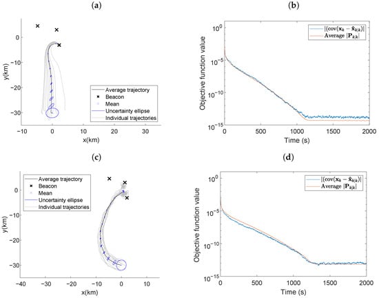 Average vehicle trajectory with position uncertainty ellipses placed every 100 s using (a) LSLA and (c) RIG algorithms in the optimal maneuvering scheme with a less informative beacon formation. Actual and average theoretical objective function value using (b) LSLA and (d) RIG algorithms.