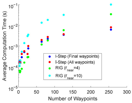 The average time for the LSLA and RIG algorithms to produce an optimal waypoint as the total number of waypoints is increased.