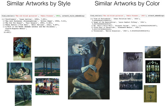 Our dataset contains a total of 68,094 artworks and their corresponding vectors, with 1626 unique artists, 132 unique styles, and 42 unique genres (We release our dataset and demo notebooks on GitHub: https://github.com/bhargavvader/WikiArtVectors, accessed on 9 June 2022). There are a total of 24,857 temporal artist vectors, 6055 temporal style vectors, and 6402 temporal genre vectors at different levels of aggregation. In this section, we will showcase some of the use-cases of such a framework. In our demo Jupyter notebooks, we showcase some of the use-cases of our vectors and representations. We broadly demonstrate three use-cases: (1) retrieving similar artworks, (2) clustering similar entities, and (3) measuring change over time. We note that these use-cases only touch the surface of all the possibilities with this vectorised data-set.