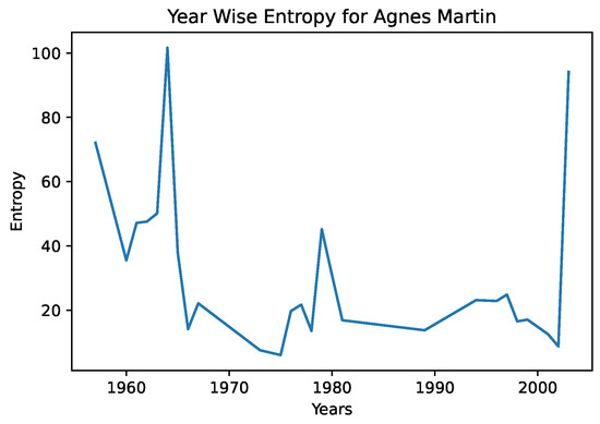 In Figure 4 and Figure 5, we see the year-wise style entropy for Picasso, and Agnes Martin. In this case, artworks were aggregated by year, and the distance between successive years representations were calculated, to search for changes in average artstyle. We note in the entropy diagram for Picasso that the average distance is higher, suggesting that he frequently changed art styles. In the case of Agnes Martin, a celebrated Canadian-American abstract painter, we see sharp changes earlier and later in her artworks, and a lower distance from the 1970s–2000s. However, on closer inspection of Agnes Martin’s work, we note that she played extensively with color and arrangements, pioneering the field of abstract expressionism. This differs greatly from the object-focused artwork of Picasso—a CNN would be better able to capture the style and texture of cubism than abstract expressionism. This example serves to illustrate that the entropy measures must be interpreted in a grounded fashion and in conjunction with color representations.