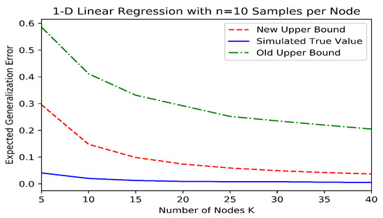 The result in Theorem 4 is general enough to apply to many problems of interest. For example, if , then the Bregman divergence gives the ubiquitous squared loss (i.e., ). For a comprehensive list of realizable loss functions, the interested reader is referred to [19]. Using F above, Theorem 4 can be applied to ordinary least squares regression, which we will examine in greater detail in Section 4. Other regression models such as logistic regression have loss functions that cannot be described with a Bregman divergence without the inclusion of additional nonlinearity. However, the result in Theorem 4 is agnostic to the algorithm that each node uses to fit its individual model. In this way, each node could fit a logistic model to its data, and the total aggregate model would then be an average over these logistic models. Theorem 4 would still control the expected generalization error for the aggregate model with the extra factor. However, critically, the upper bound would only be for the generalization error that is with respect to a loss of the form , such as quadratic loss.