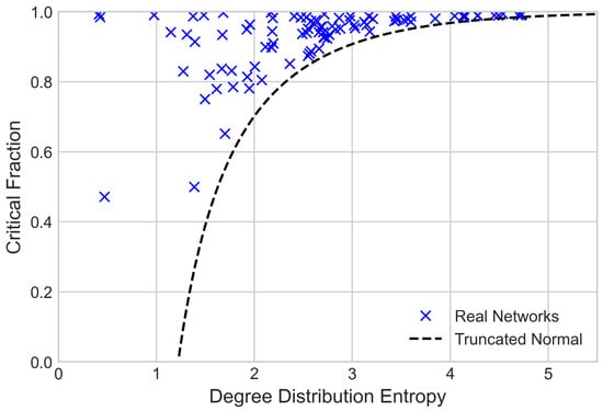 Note that, since only degree distributions are used, these results treat the real-world networks as if they were randomly configured. From Figure 1, we can see that the Molloy-Reed critical fraction is not a function of degree distribution entropy, although we can see that as degree distribution entropy increases, there is an increasing lower boundary for the critical fraction. The reason for this boundary is found in the maximum entropy principle. Given a critical fraction and, thus, a ratio of first and second moments, there exists a degree distribution on which maximises the entropy. This is a truncated normal distribution for the range [], with a degree distribution given by the equation
