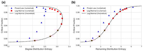 Both Equations (19) and (20) are functions of . (and thereby critical fraction) always increases as increases, and it is trivial to differentiate by to show that it reaches its maximum at , substantiating the turning point in degree distribution entropy shown in Figure 2a. Equation (20) is used to calculate the log-normal (theoretical) curve in Figure 2a.