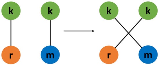 First, we consider a real-world social network based on Facebook pages that mutually “like” one another, called “fb-pages-tvshow” in the Supplementary Materials []. This network has its configuration altered while keeping its degree-degree correlations constant by repeatedly applying an edge swap algorithm []. This algorithm chooses two edges such that one node of one edge has the same degree value as one node of the other edge. The edges are then rewired by swapping the nodes with an equal degree with one another. This algorithm is depicted in Figure 3.