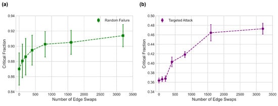 Simulated critical fraction values against number of correlation preserving edge swaps for the “fb-pages-tvshow” social network []. (a) shows data for robustness against random failures, and (b) is for robustness against targeted attacks. Critical fraction measurements were taken 100 times for each interval, with average values and standard deviation being recorded.