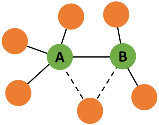 Diagram of connections for two adjacent nodes. Nodes A and B have one common neighbour with which they form a triangle, and the edges leading to that node are shown as dashed lines. For the “standard” joint distribution these edges are included when counting the degree values of A and B, but for the joint distribution “with clustering” they are not counted.