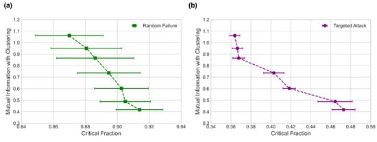 Mutual information with clustering against simulated critical fraction values the “fb-pages-tvshow” social network [] undergoing edge swaps, for (a) random failures and for (b) targeted attacks.
