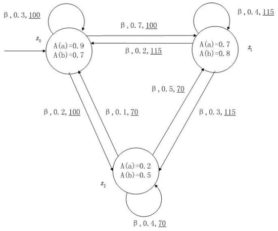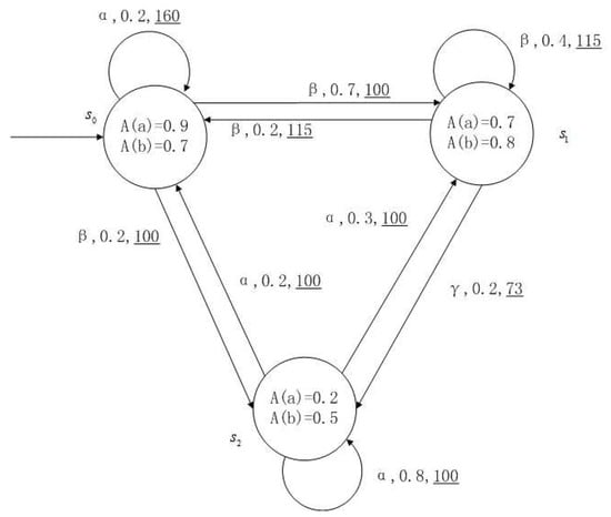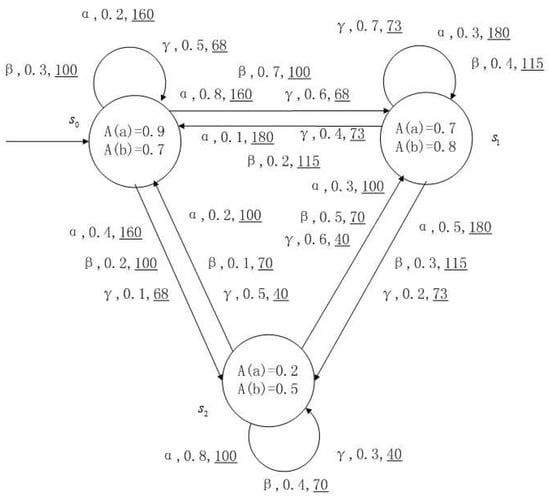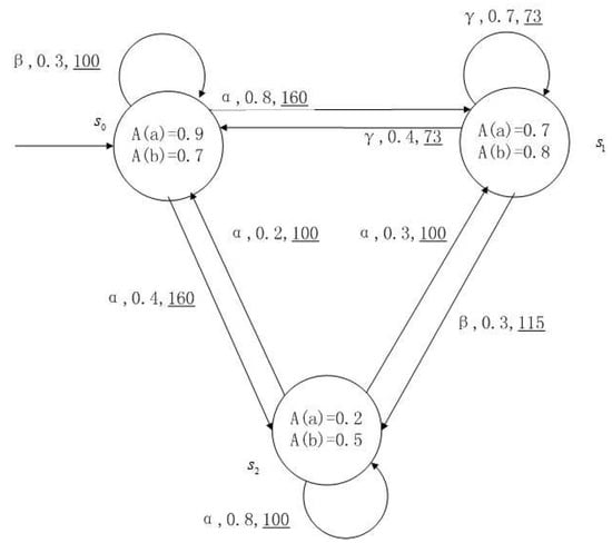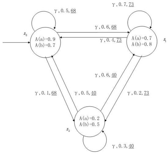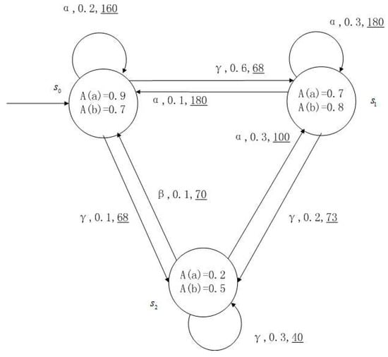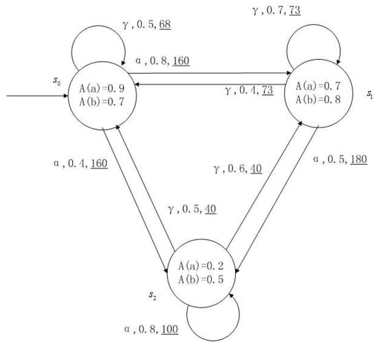 Figure 1, Figure 2, Figure 3 and Figure 4 is a simple, in which there are three transitions represented by α, β and γ. The model has three states , and . The variables in the state indicate the atomic proposition a and b. Different states have different memberships of atomic propositions. Therefore, we use fuzzy values to describe them. When action is used in state , cost function is generated. When using a single transition α or β or γ, the FKSs are shown in Figure 1, Figure 2 and Figure 3. The FDPC produced by them is shown in Figure 4. The transition possibility is given by the number on the connecting line, and the cost is indicated by the underlined number in the figure. For example, indicates that in state , using treatment scheme α, the possibility of transition to state is 0.8, and the treatment cost is 160.