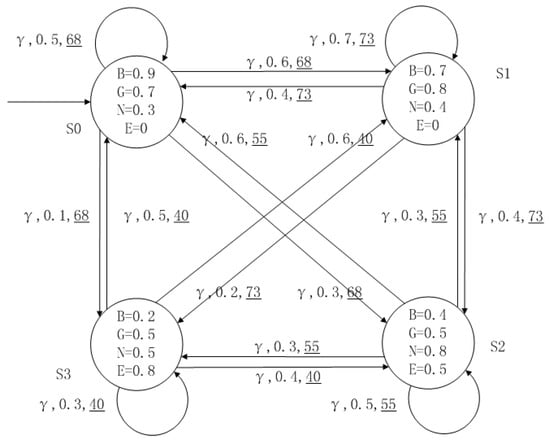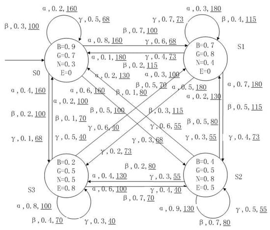 A medical expert system is an intelligent computer system that collects, sorts and analyzes a large number of cases by computer, concentrates on the diagnosis results of medical experts, and diagnoses and treats patients. Because of the different judgment standards of each expert for the degree of the patient’s conditions and the effect of the treatment plan, using a fuzzy system can reflect the operation process of the system closer to the real world. Figure 10, Figure 11, Figure 12 and Figure 13 is a simple medical expert system, in which there are three experts. Each expert gives different treatment plans, which are represented by , , . The model has four states of the patients, respectively, represented by , , , . The variables in the state indicate the patient’s health states, which can be divided into B(bad), G(general), N(normal) and E(enough). Different experts have a different understanding of these four health conditions. Therefore, we give fuzzy values to the four to show the health of patients. When treatment scheme is used in state , cost will be generated, indicating the treatment cost of the scheme. When using a single treatment scheme, the state transition of patients is shown in Figure 10, Figure 11 and Figure 12. When three experts consult, a complex system is synthesized, as shown in Figure 13. The connecting line with the arrow in the figure indicates transition. The transition possibility is given by the number on the connecting line, and the cost is indicated by the underlined number in the figure. For example, indicates that the patient is in state , using treatment scheme , then the possibility of transition to state is 0.8, and the treatment cost is 160.