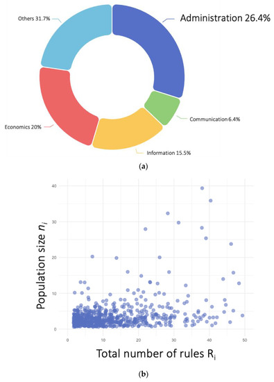 Consider the Minecraft environment, which consists of multiple servers, each of which is indexed by i (N = 13,859 servers). Within each community, we identified four categories of rules: administrative, informational, communication, and economics (see Figure 1a). Taking administrative rules as an example, the relative frequency of administrative rules in community i is , where is the number of administrative rules, and is the total number of rules in community i. Some communities might have many rules but a small population (see Figure 1b), so we considered it useful to create a measure of rule fraction weighted by membership population size. In most cultural evolution work, in order to estimate the fraction of a cultural trait within a population, researchers either calculate the number of individuals that carry a specific cultural trait weighted by the overall population size [57] or the number the artifacts of a kind of cultural feature weighted by the production size [58]. It is tricky to apply this kind of calculation to organizational and institutional evolution because conceptually, the individuals in the organization do not directly carry the cultural trait and the total number of rules does not reflect the “production size” of the community. Therefore, to establish the connection between the rule frequency to organizational size and to make sense of differential cultural transmission, we used the frequency of administrative rules weighted by population size to estimate the fraction of institutional traits among all communities. For simplicity, we refer to this measure as the “reach of rules” (i.e., the extent of their contact with the population).