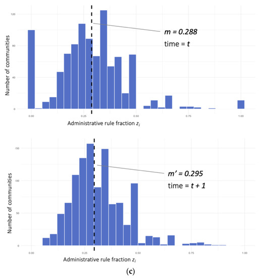 We now introduce a new variable, , to track the rate of change of population shares, where is the proportion of administrative rules in the next time interval.