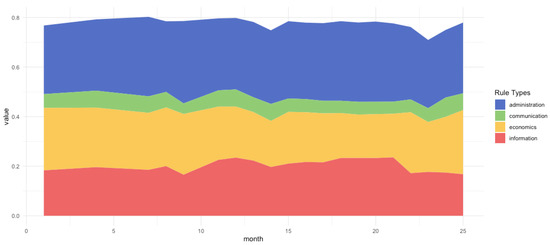 Environmental changes over time cause changes in the number of communities but do not seem to change the overall relative proportions of rule types in the population, except for administrative rules. The Price equation assumes a constant correlation between population growth and the implementation of one type of rule. However, the correlation may vary over time in a fast-changing environment. The changing bandwidth of administrative rules in this figure demonstrates that various rules are influenced differently by environmental changes.