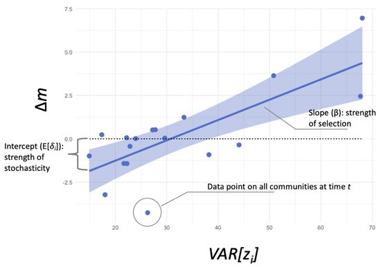 where the coefficient β is the relative population growth based on the frequency of administrative rules , and the var [] is the total variance of administrative rules among all communities. In this equation, the slope reflects the strength of selective forces, and the intercept represents the strength of stochastic forces [58].