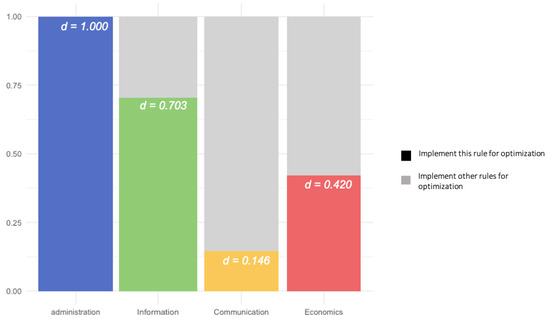 Solving for the optimal distribution of administrative rules sometimes results in undefined combinations of rule shares, including cases where the optimal share of rule i is negative (d < 0) or above 1 (d > 1). When d < 0, it suggests that the optimal strategy is to implement other rules only. Accordingly, for d > 1, the optimal strategy is to implement rule i only. These two extreme cases describe the so-called “pure strategy”. If the optimal strategy for rule i is a pure strategy of full investment in rule i, it indicates that (1) the frequency of change to rule i can be attributed to earlier investment in that rule, as opposed to other rules. In other words, the frequency of change of rule i is driven solely by selection; and (2) environmental changes do not alter the growth rate of rule i [63].