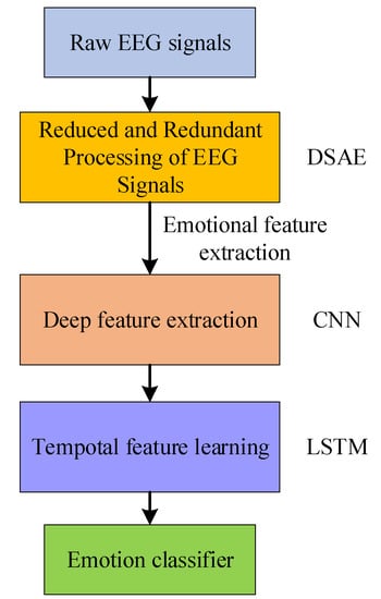 Recently, emotional electroencephalography (EEG) has been of great importance in brain–computer interfaces, and it is more urgent to realize automatic emotion recognition. The EEG signal has the disadvantages of being non-smooth, non-linear, stochastic, and susceptible to background noise. Additionally, EEG signal processing network models have the disadvantages of a large number of parameters and long training time. To address the above issues, a novel model is presented in this paper. Initially, a deep sparse autoencoder network (DSAE) was used to remove redundant information from the EEG signal and reconstruct its underlying features. Further, combining a convolutional neural network (CNN) with long short-term memory (LSTM) can extract relevant features from task-related features, mine the correlation between the 32 channels of the EEG signal, and integrate contextual information from these frames. The proposed DSAE + CNN + LSTM (DCRNN) model was experimented with on the public dataset DEAP. The classification accuracies of valence and arousal reached 76.70% and 81.43%, respectively. Meanwhile, we conducted experiments with other comparative methods to further demonstrate the effectiveness of the DCRNN method.