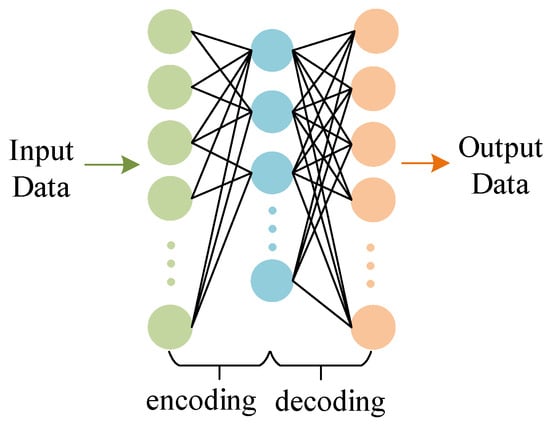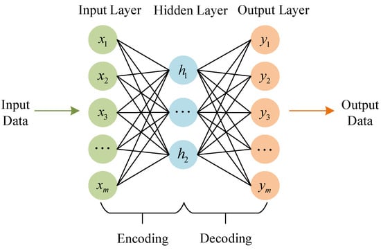 The autoencoder consists of two parts, encoded and decoded, which are divided into three layers, namely, the input layer , the hidden layer , and the output layer . The cost function used in conventional AE is the mean square error (MSE), as shown in Equation (1).