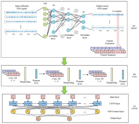 Firstly, a deep sparse autoencoding (DSAE) algorithm was used to reduce the dimensionality of the EEG to obtain an EEG with redundant information removed. The deep sparse autoencoder network was composed of multiple sparse autoencoder networks stacked, as shown in Figure 4a. The sparse autoencoder drew on the neuron excitability mechanism of the brain. After encoding, the original data were decoded to the greatest extent possible. At the same time, it also had the advantages of a fast convergence speed and training did not easily fall into the local minima. The deep sparse autoencoding network contained three hidden layers. After the encoding was completed, the brain power signal was extracted from the last hidden layer. The original DEAP EEG signal was collected at 8064 samples in 1 min, with 7680 samples after removing the 3-s baseline signal. A 1-s window was applied to the EEG source signal, dividing the signal into 128 frames. After the signal was framed, EEG emotional features were extracted from each frame by a feature extraction method and arranged into a 128-frame feature sequence.