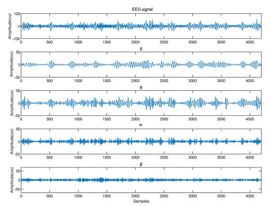 Secondly, the condition of the brain changed, which was determined by rhythmic signals from various parts of the brain. EEG signals were divided into (4–7 Hz), (8–13 Hz), (14–30 Hz), and (31–50 Hz) according to the frequency range. The EEG raw signal in the DEAP dataset is shown in Figure 5, along with the four frequency bands. We applied a “hanning window” to each EEG channel and used the Welch method [20] to calculate the PSD characteristics. The PSD values calculated from the four bands of the signal are shown in Figure 6. The PSD feature sequence was used as the input of the neural network, as shown in Figure 4b. For the CNN part, the emotional features of the EEG signal for each channel were extracted automatically using a one-dimensional convolutional neural network. We set up three convolutional layers, each followed by a maximum pooling layer and a dropout layer. Based on the input feature sequences, we chose a suitable convolutional kernel size of 1 × 5 and a step size of 1. This allowed us to fully traverse each EEG emotion feature. An appropriate kernel size not only extracts the emotional features adequately but also reduces the number of parameters generated during the training process. The convolutional layer was followed by a rectified linear unit (ReLU) activation function to incorporate non-linear factors so that the output of some of the neurons in the network was 0 after training, providing a moderate degree of sparsity and accelerating convergence of the network. It also reduced the interdependence of the parameters and avoided the overfitting problem of the model, thus improving the generalization ability of the model.