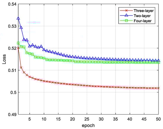 The loss values of the comparative experiments of the three-structure DSAE networks are shown in Figure 10. The loss rate on the DSAE with a two-layer structure stabilized after 50 iterations. After 50 iterations, the classification loss rate of the three-layer DSAE dropped from the initial 0.52 to 0.50, which was about 0.01 lower than that of the two-layer DSAE. The DSAE loss rate of the four-layer structure was finally 0.51, which was slightly higher than that of the three-layer structure. Through the loss value graph, it can be seen that the DSAE with the lowest loss rate was the three-layer structure and it can also be seen that the DSAE three-layer structure reached the steady state more quickly. To verify the reconstruction ability of the autoencoder, we plotted the original EEG signal; the reconstructed signal is shown in Figure 11. We can see that the reconstructed signal maintained the largest features of the original signal.